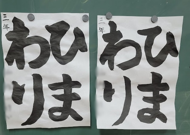 一文字ずつ新聞で練習して半紙に書いていきます。