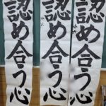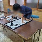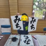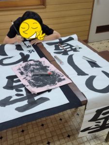 2年生 4年生 合計4人。自分よりも大きなサイズの半紙に一文字ずつ。
